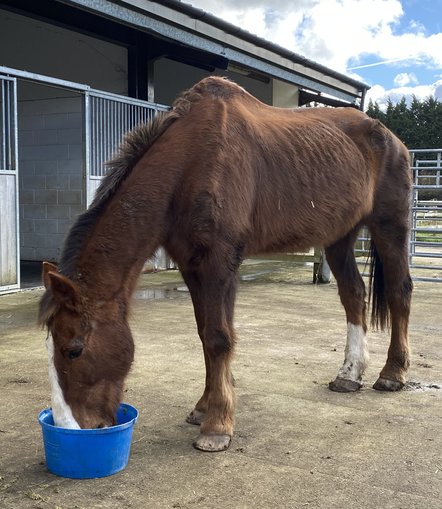 Our vets set to work assessing Murphy straight away, giving him a full blood profile and overall health check. The dentist attended to his teeth, he was wormed and put on a course of steroids to help give him boost in the right direction. Given his severe malnourishment, rebuilding Murphy’s strength required a carefully structured feeding programme. Our team developed a tailored nutrition plan designed to restore his condition gradually and safely, without overwhelming his fragile system. Equine rehabilitation for cases like Murphy’s requires patience, expertise, and close monitoring - something our team is highly experienced in providing. Day by day, Murphy started to look brighter. With patience, consistency, and expert care, his transformation was underway.