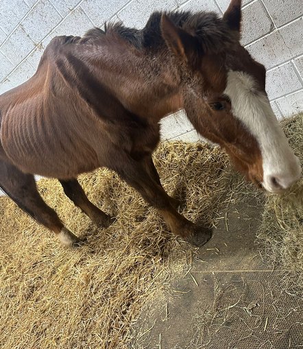 In 2023, HorseWorld was contacted by the RSPCA with an urgent plea to care for a severely malnourished Irish Thoroughbred named Murphy. The 27-year-old gelding had been rescued following a neglect case and desperately needed specialist equine rehabilitation. When Murphy arrived at HorseWorld, he was in a shocking condition. With a body condition score of just 0.5, he was emaciated - little more than skin and bone. It was clear he needed immediate veterinary intervention and a carefully managed recovery plan.