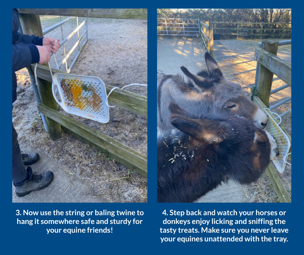 Here is how we make our Lick Trays, but if you want even more fun ideas to help keep your equine friend entertained, click the link at the bottom of this page to download a pdf full of more suggestions and ‘how to’ guides.