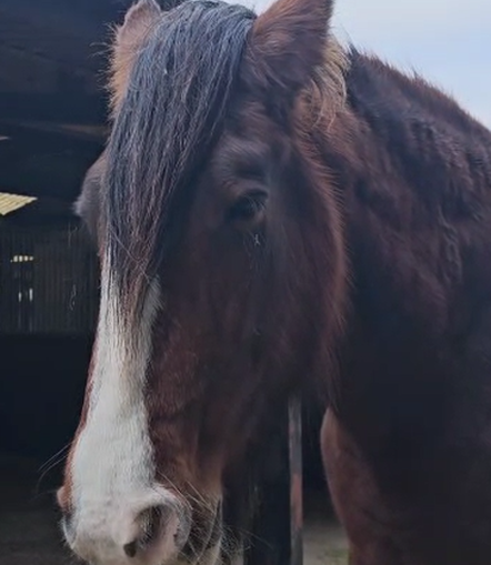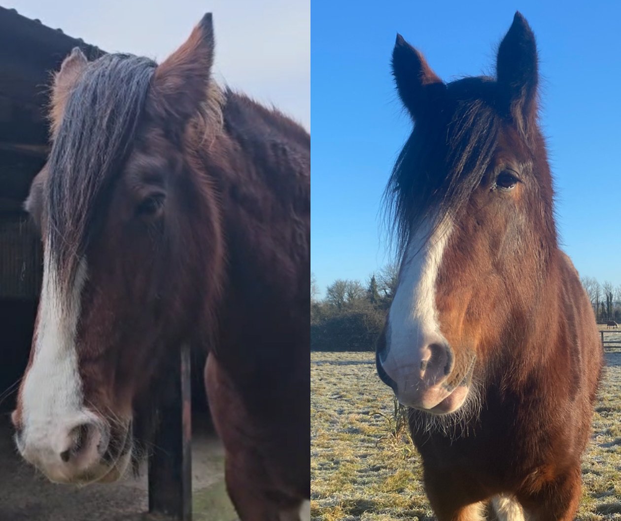 On the left shows Shire horse Lolly with her ears pinned back, tension above the eye area, eyes partially closed and her nostrils flared - all signs of pain, in contrast to Lolly on the right with a happy, relaxed face and no signs of tension.
